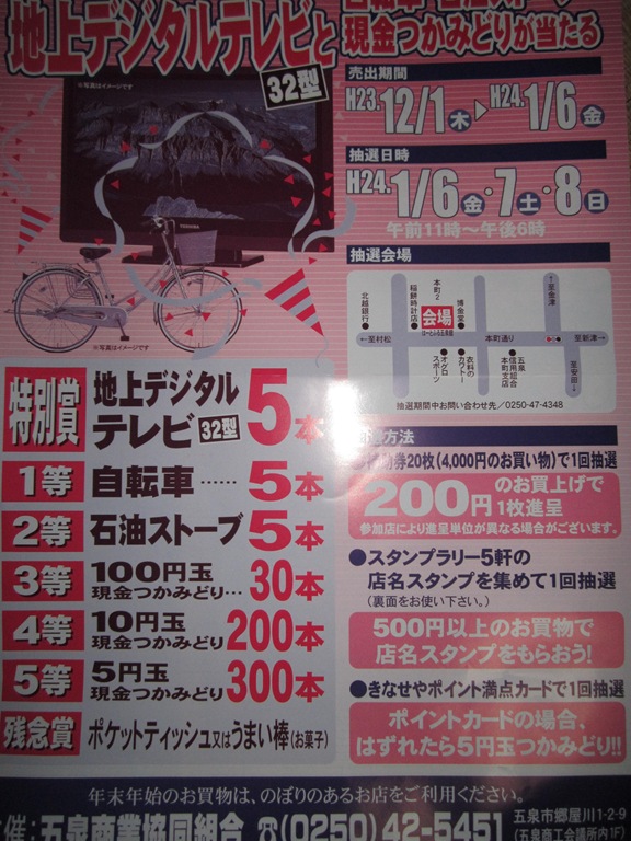当店を含む、五泉商協加盟店で、お買い上げ200円で1枚の補助券を進呈、20枚(4,000円のお買い物)で1回抽選することが出来ます。