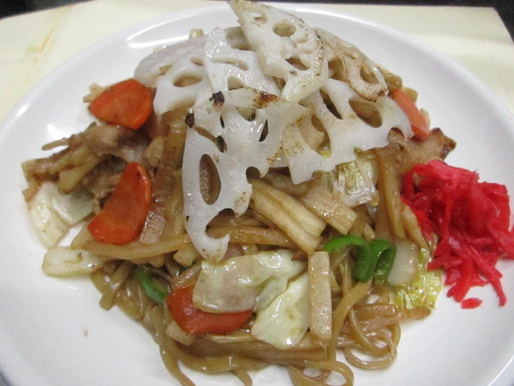 れんこんと大根をたっぷり使ったソース味の焼そば。