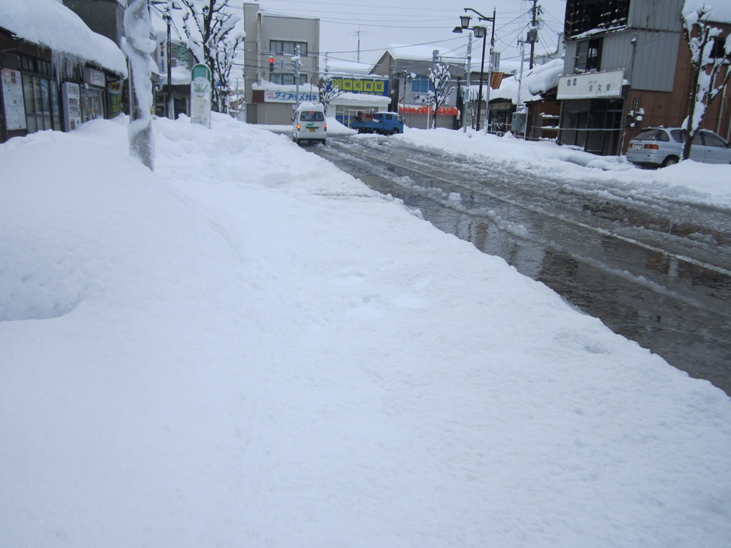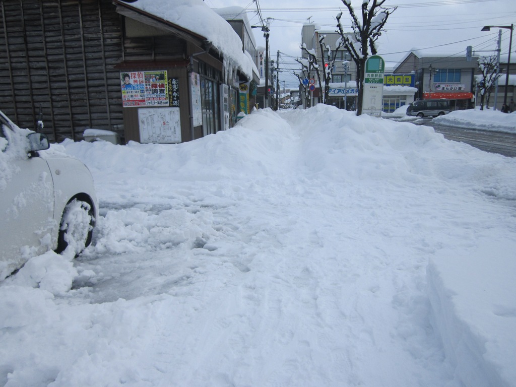 五泉市駅前という場所は、雪の捨て場がなく、いけないと分かりつつも道路へ雪を投げて除雪をします。