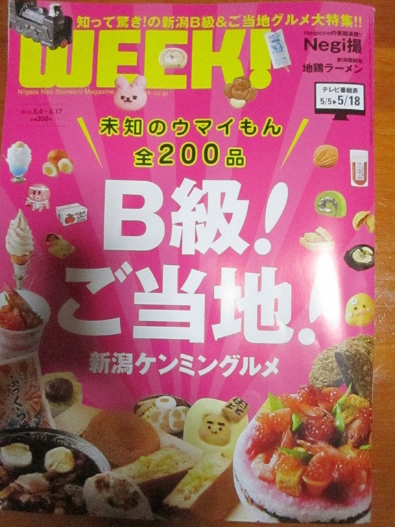 今回のWEEKの特集は、「B級!ご当地!新潟ケンミングルメ」ということで、五泉市のご当地グルメさといも麺として掲載されています。