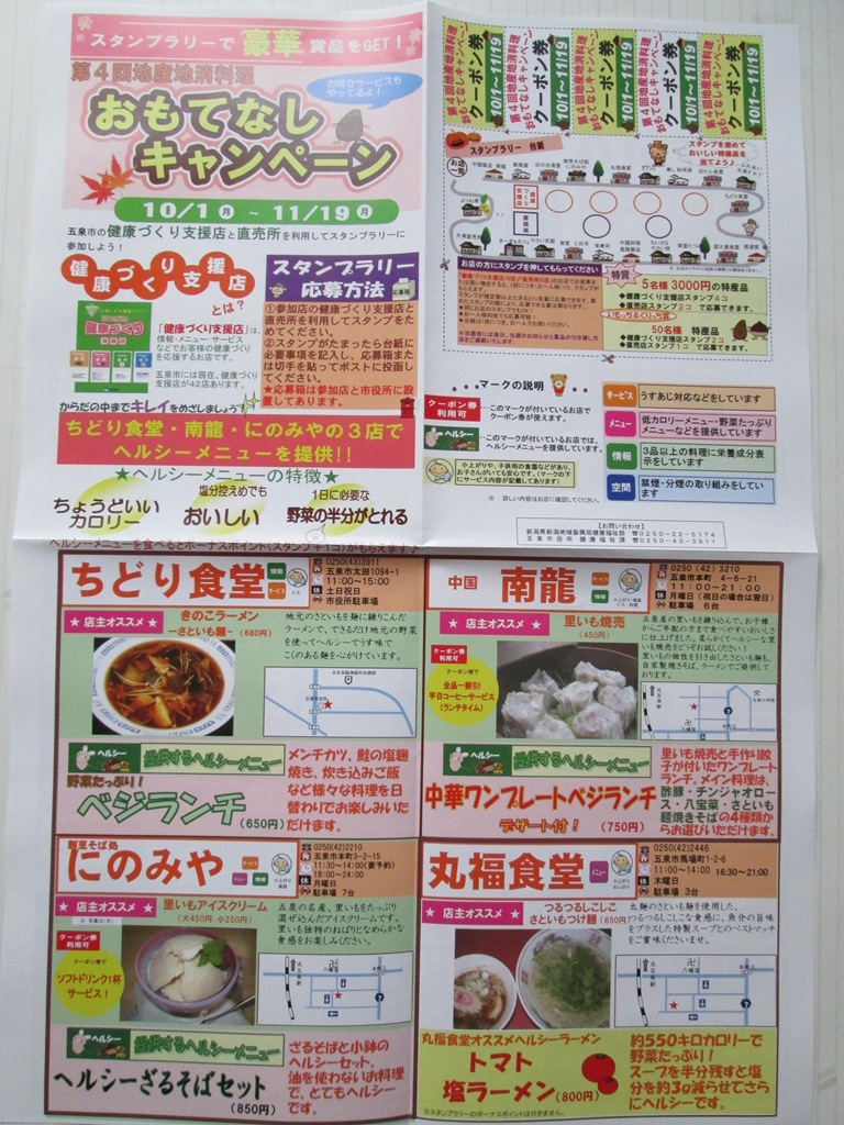 10月1日から11月19日までの間、「五泉市健康つくり支援店」では、第4回地産地消料理おもてなしキャンペーンを開催中です。
