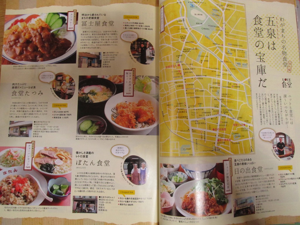 県内各地の食堂が紹介されているなかに「五泉は食堂の宝庫だ」というサブタイトルで、五泉市の食堂が見開きで紹介されています。