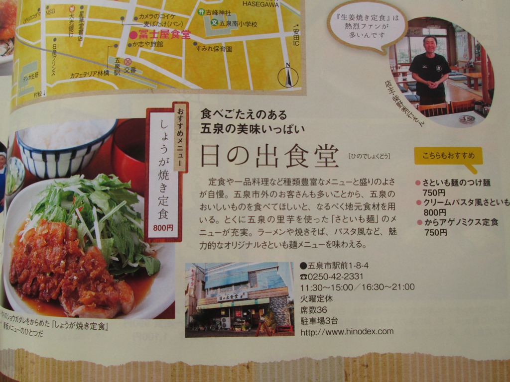当店「日の出食堂」に「冨士屋食堂」、「食堂たつみ」、「ぼたん食堂」の4軒が五泉市街なかの地図とともに人気メニューと店主の写真入りで掲載。
