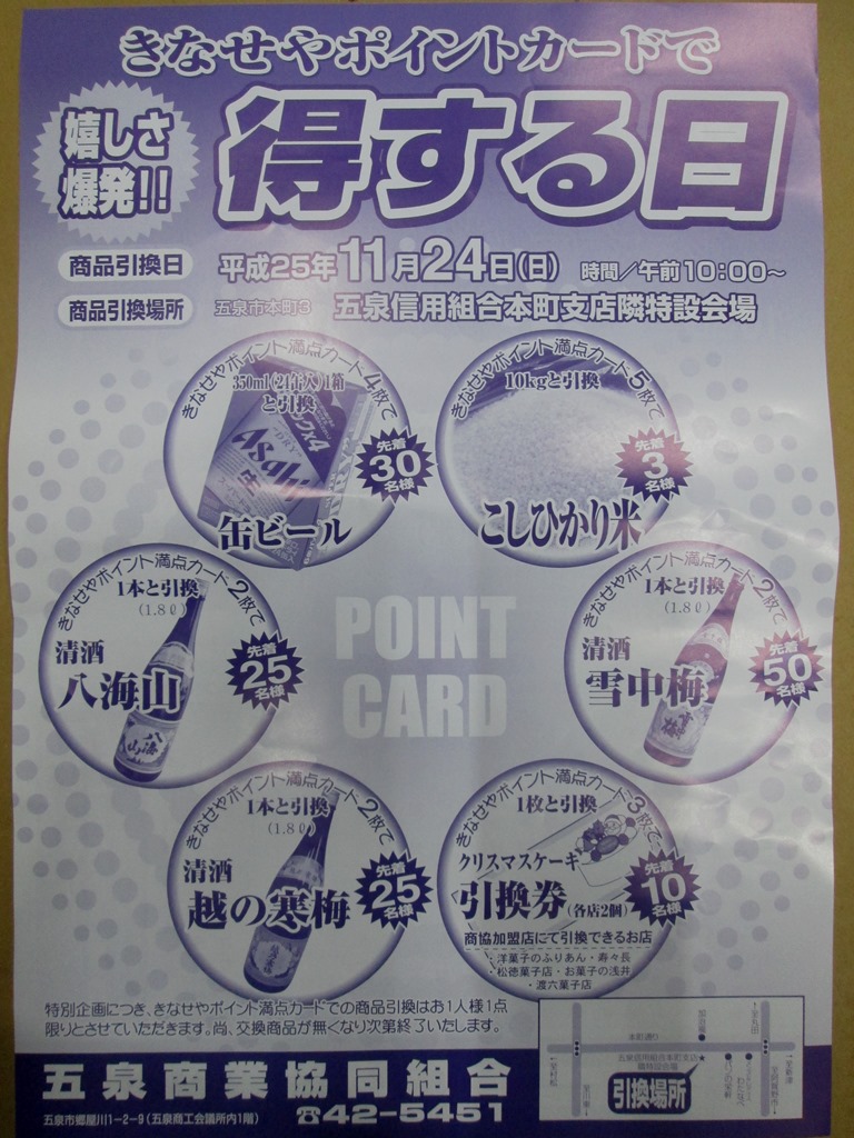 さて、今週末24日の日曜日、五泉商協が発行している「きなせやポイントカード」のお得な一日です。