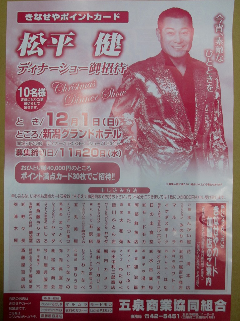 そして一番の目玉は、満点になったポイントカード30枚で12月1日の新潟グランドホテルで開催される松平健ディナーショーにご招待。