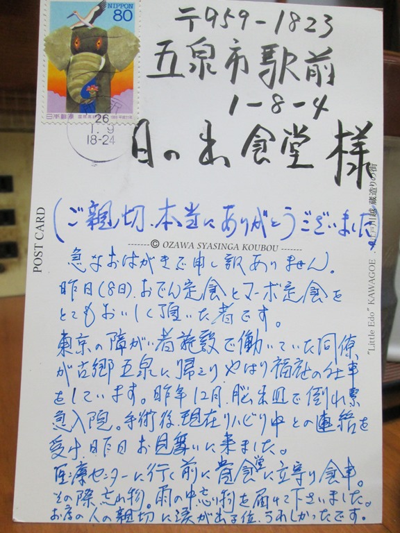 先週食事をして帰られたお客様から、お礼のはがきを頂きました。