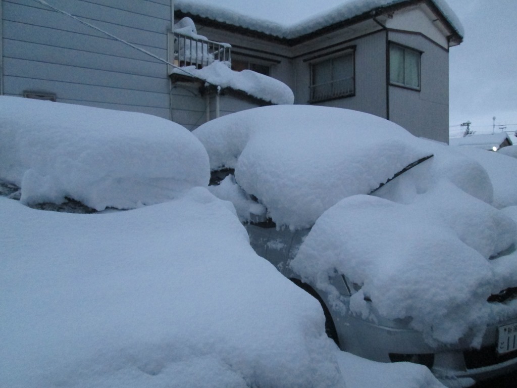 朝6時には駐車場の車にどっさりとこの通り、もはや運転席のドアを開けるにも雪をまず落とさなければなりません。