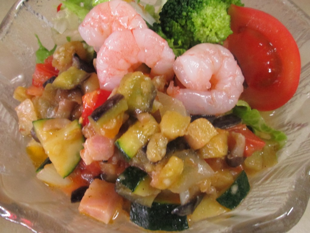 和風のかけ汁に浸された冷たいさといも麺に、オリーブオイルで炒めた夏野菜をのせた絶妙のコンビネーション。