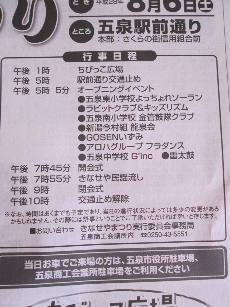 8月6日(土)、五泉市近郊の新潟市では「新潟まつり」、三条では「三条夏まつり」と各地で夏祭りも行われるようです。