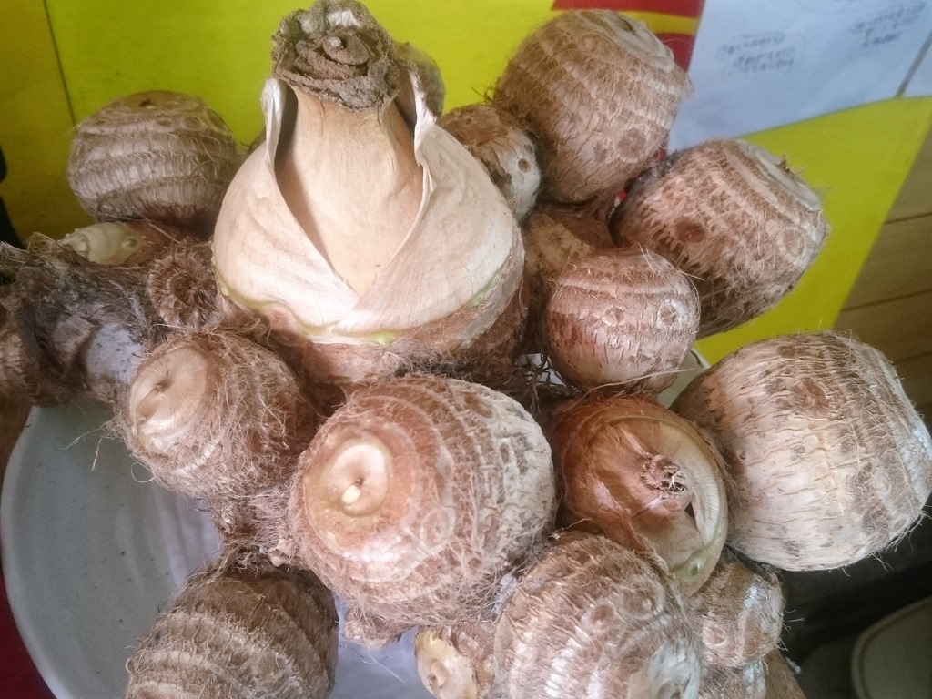 飾られているものは正真正銘の五泉の里芋「きぬおとめ」の株です、当店にご来店の際にはどうぞご覧くださいませ。