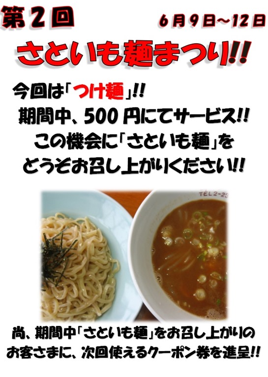 その「つけ麺」を500円で提供する日の出食堂的「第2回さといも麺まつり」、本日より決行します。