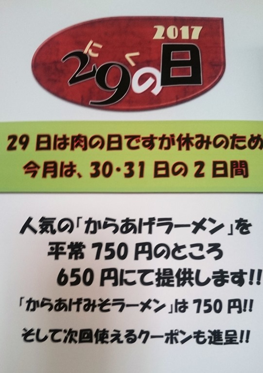 で、そのお詫びではありませんが「肉の日」、30日と31日の2日間、からあげラーメンを100円引きにて提供します。